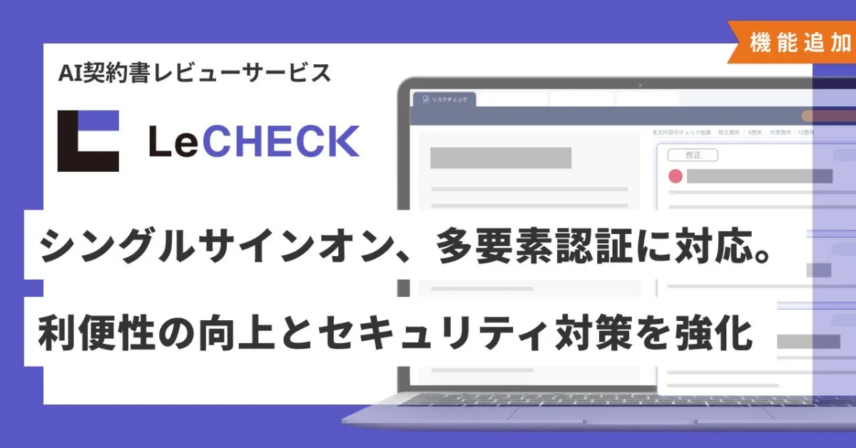 株式会社リセが運営するAI契約書レビューサービス「LeCHECK(リチェック)」が、新たにシングルサインオン(SSO)と多要素認証(MFA)への対応を発表しました。この機能の追加により、ユーザーは複数のサービスを利用する際に、毎回の認証プロセスを省略でき、利便性が大幅に向上します。さらに、強化されたセキュリティ対策により、より安心してサービスを利用することが可能となります。