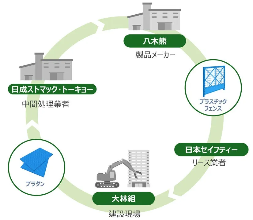 具体的には、大林組の建設現場で発生した廃プラスチックを、まずは協力企業の日成ストマック・トーキョーで収集します。その後、プラダンが選別・圧縮され、株式会社八木熊で原材料として加工されることになります。ここで30%のプラダンを混合し、工事用フェンスが製造されます。完成したフェンスは、日本セイフティーが大林組の現場にリースし、プロジェクトに活用されます。