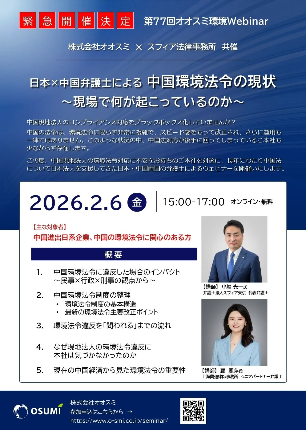 2026年2月6日、弁護士法人スフィア東京は株式会社オオスミと共催でウェビナー「日本×中国弁護士による 中国環境法令の現状」を開催しました。このオンラインセミナーには、当事務所の代表弁護士である小堀光一が講師として登壇し、中国における環境法令の実務的な対応について詳しく解説しました。