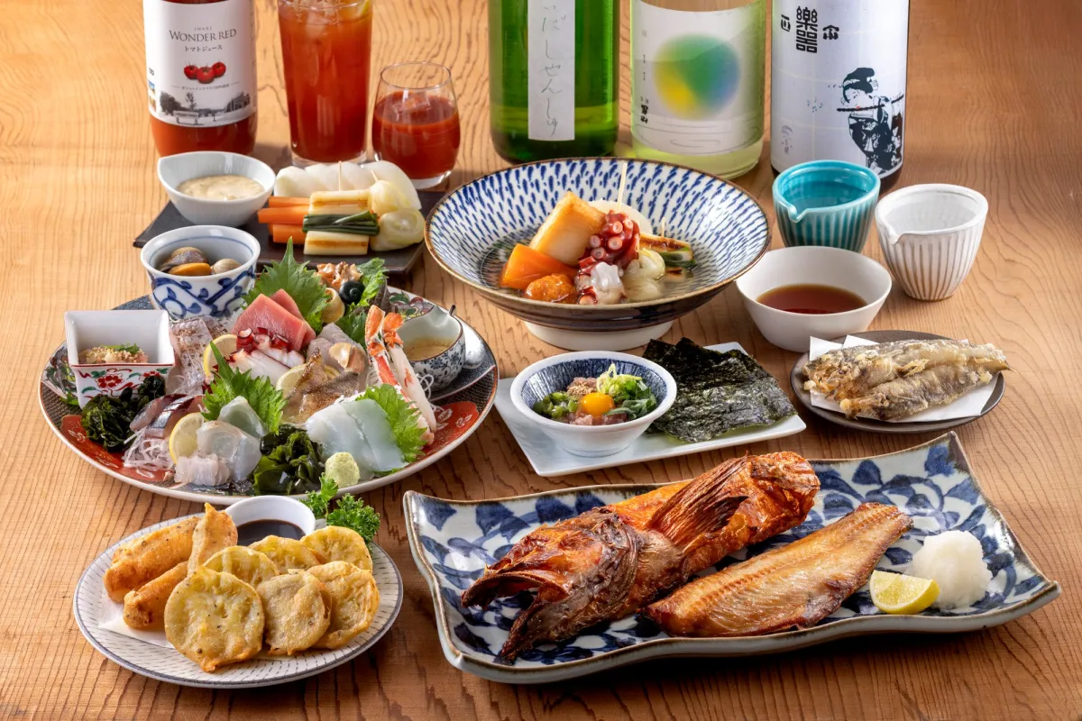 福島の地酒もフェアの大きな魅力です。「楽器正宗」や「会津男山」のような人気酒が揃い、地元の味道との相性も抜群。これらは山海の食材だけでなく、ノンアルコールのトマトジュースも提供されます。