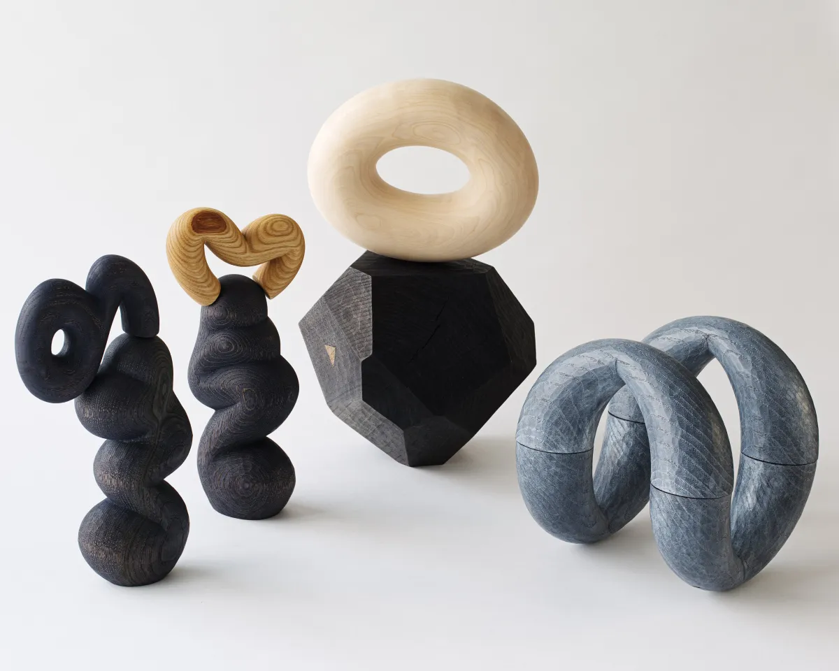 嘉手納氏の作品は、柔らかな曲線が特徴で、木材の特性をうまく活かしています。特に注目すべきは、釘や接着剤を一切使用せず、木材に埋め込まれた磁石の力を利用してパーツを組み合わせている点です。この独自な構造により、見た目にも不思議で、まるで浮遊しているような感覚を覚える作品が誕生します。作品は、木材の色合いや木目、質感を活かして手作業で丁寧に削り出されます。