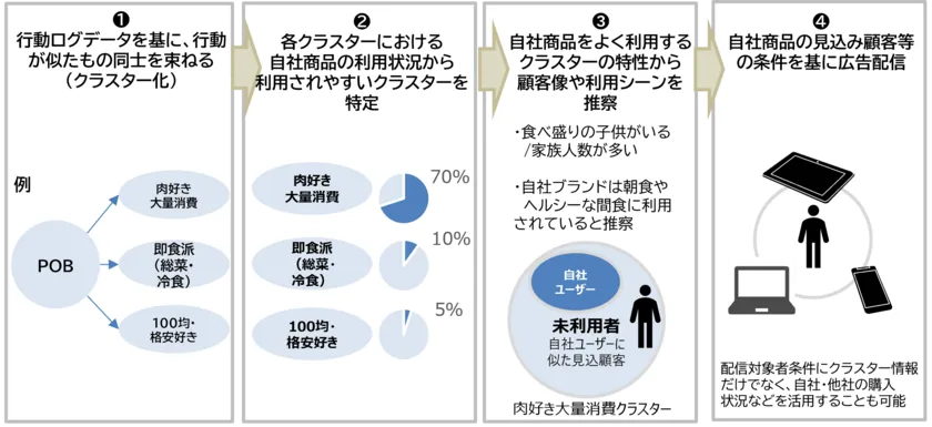 新たな広告配信サービスでは、POB-αから得られる購買クラスター情報を基に、実際の消費者の行動を深く理解することができます。これにより、「誰が」「何を」「どれくらい」購入しているのかを把握し、ターゲットを精密に絞り込むことが可能となります。特に、消費者の行動が似たグループを特定することで、広告の配信効率を大幅に向上させることが期待されています。