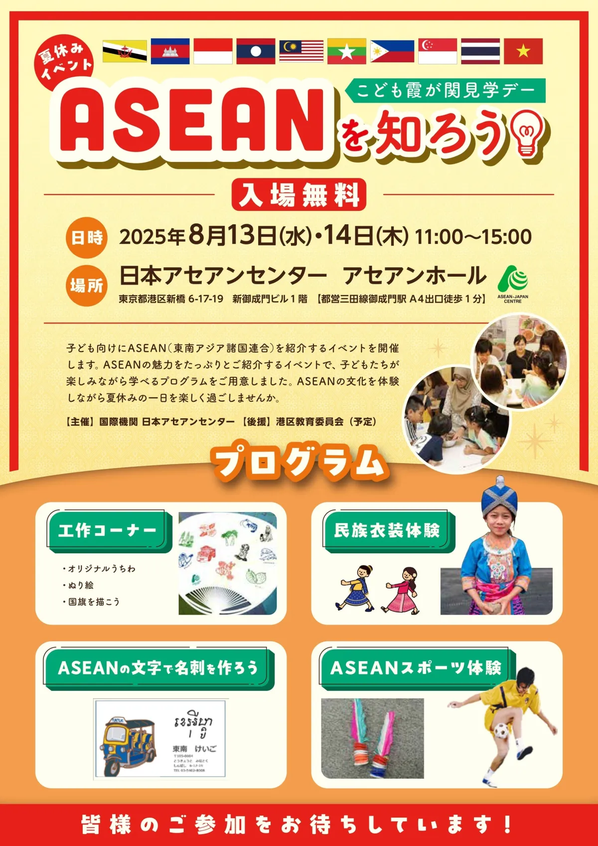 日本アセアンセンターは、2025年8月13日(水)と14日(木)に、未就学児から小学生を対象にした特別イベント「ASEANを知ろう!」を開催します。このイベントは「こども霞が関見学デー」の一環として実施され、ASEAN諸国の文化や遊びを楽しく学ぶ機会です。