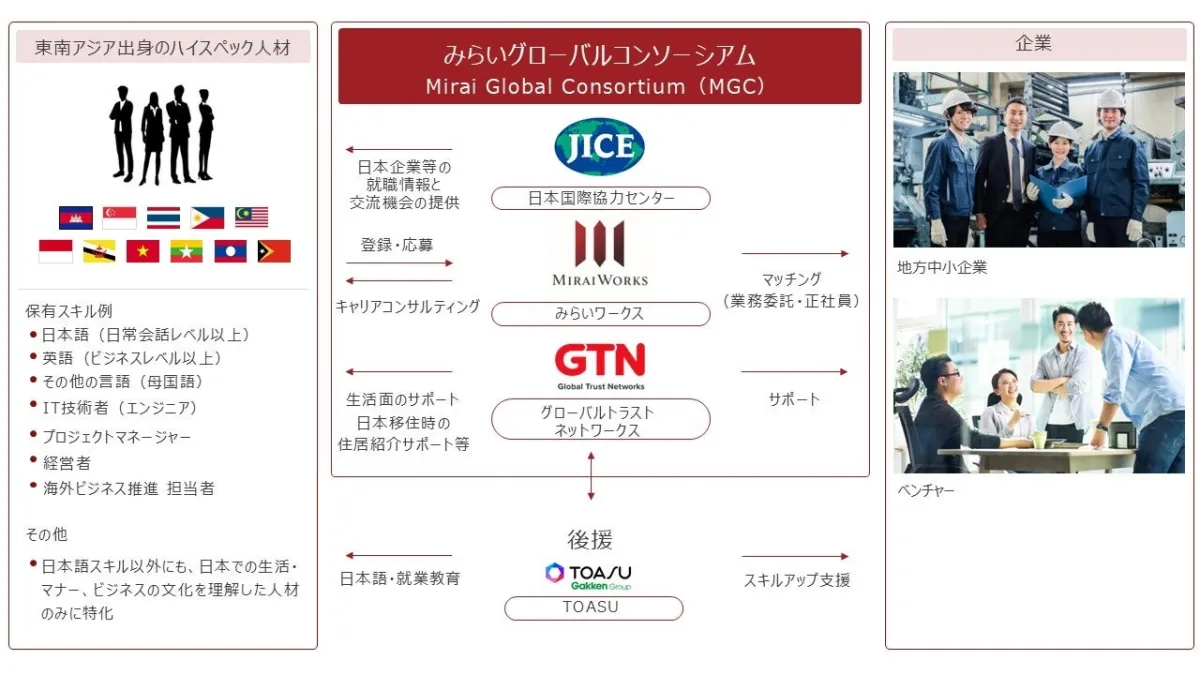 TOASU(株式会社学研ホールディングスのグループ会社)は、現在、東南アジアからのハイスペック人材の日本における就業を支援する新しいプロジェクトを進めています。これは、株式会社みらいワークス、独立行政法人国際協力機構(JICE)、株式会社グローバルトラストネットワークス(GTN)と共同で設立した『みらいグローバルコンソーシアム(MGC)』を通じて行われるものです。