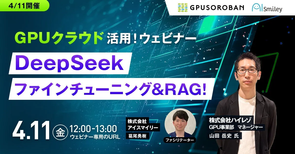 株式会社アイスマイリーが主催するウェビナー『DeepSeekファインチューニング&RAG!GPUクラウド活用ウェビナー』が、2025年4月11日(金)12時から開催されます。このイベントは、AI技術に関心がある方々に最適な学びの機会を提供することを目的としています。