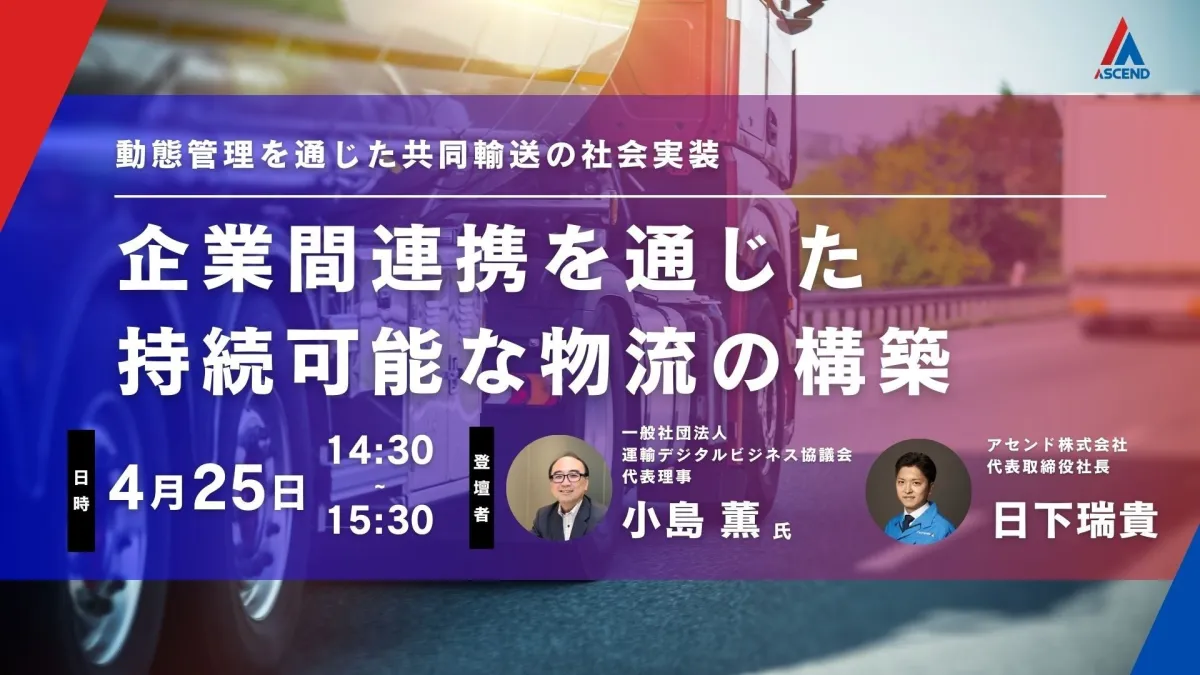 物流業界の変革を目指すアセンド株式会社は、2025年4月25日(金)に、オンラインでセミナー「企業間連携を通じた持続可能な物流の構築 ~動態管理を通じた共同輸送の社会実装~」を開催します。このセミナーでは、物流関連二法の改正に伴い、「物流事業者連携とデータ活用の可能性」をテーマに据え、運輸デジタルビジネス協議会の代表理事である小島薫氏とともに、物流の効率化への道筋を探ります。