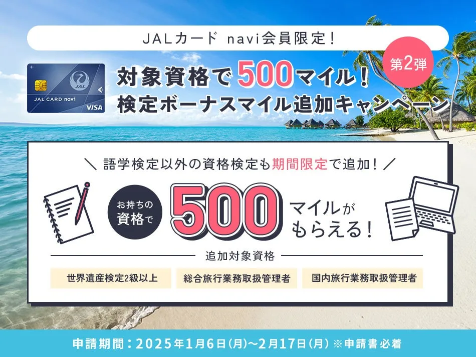 キャンペーンは2025年1月6日(月)から2月17日(月)までの期間中に実施されます。この期間内に対象資格を取得し、申請することでマイルが付与されますので、しっかりと受験を計画しておきましょう。