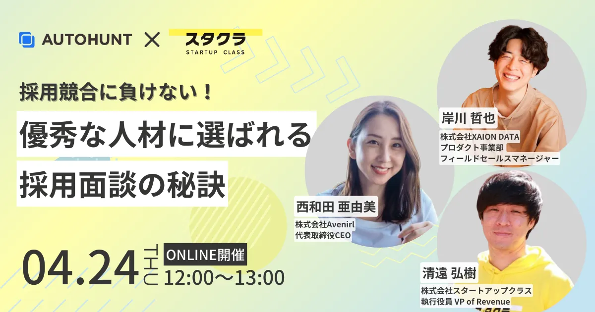 株式会社XAION DATAが主催する、有益なセミナー「採用競合に負けない!優秀な人材に選ばれる採用面談の秘訣」が、4月24日(木)12時からオンラインで開催されます。このセミナーは、採用に関する深い知見を持つ専門家たちが集結し、企業が優れた人材を獲得するためのノウハウを共有するイベントです。