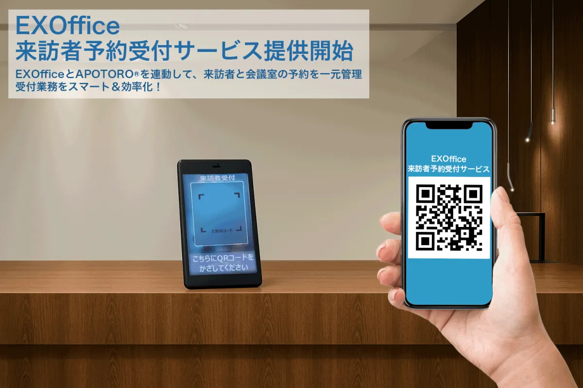 新たに導入された来訪者予約受付サービスは、QRコードを使用する「APOTORO®」とEXOfficeを接続し、両システムの情報を一元管理することができます。これにより、来訪者予約はEXOfficeの会議室予約と自動的に同期し、いつでも簡単に予約状況を把握できます。