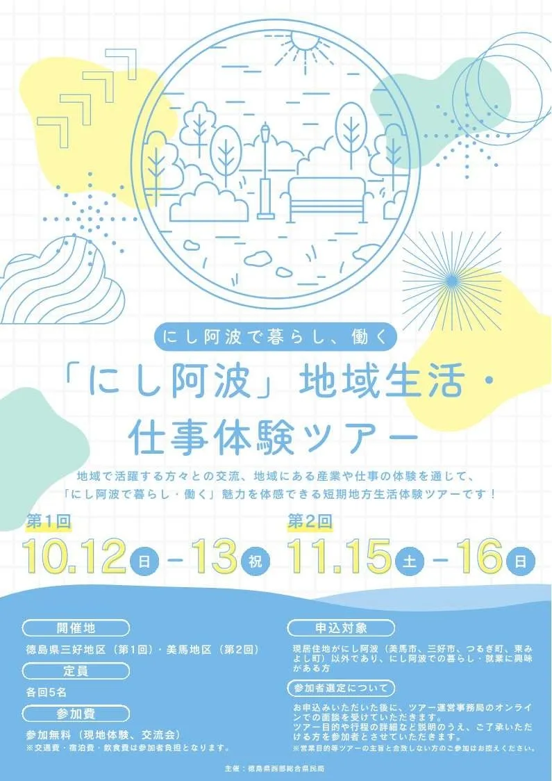 「にし阿波」は徳島県の美馬市、三好市、つるぎ町、東みよし町から成る地域で、四国山地に囲まれた自然豊かな場所です。美しい清流や懐かしい風景が広がっており、訪れると心が和むような体験が待っています。この地域は、観光、農業、林業といったさまざまな産業が盛んで、特に急傾斜地を利用した住民たちの伝統農業は、世界農業遺産にも認定されています。地域の特色を楽しむための「短期地方生活体験ツアー」が実施されます。このツアーでは、地元の事業者との交流を通じて、にし阿波での暮らしや就業の魅力をより深く理解することができます。
