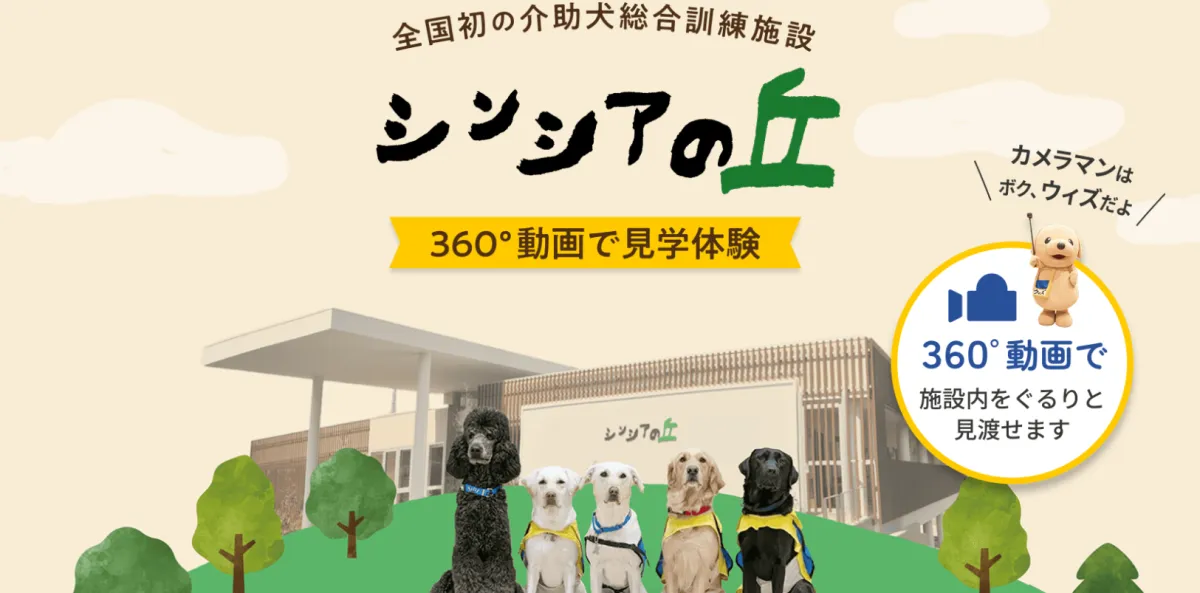 - - 360°動画の展開:施設の一部分を見渡すことができ、介助犬育成の現場を実感できます。