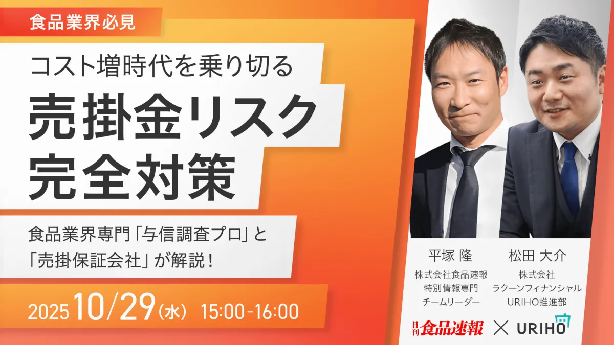 食品業界は現在、原材料の価格が高騰し続け、厳しい経営環境に直面しています。取引先の経営不振による売掛金の焦げ付きは、自社の業績にも直結する可能性があるため、リスク管理は一層重要なテーマになっています。そこで、株式会社ラクーンフィナンシャルが提供するサブスク型売掛保証サービス「URIHO」と、食品業界を専門とする与信調査会社「食品速報」が共同で、売掛金リスク対策のセミナーを開催します。