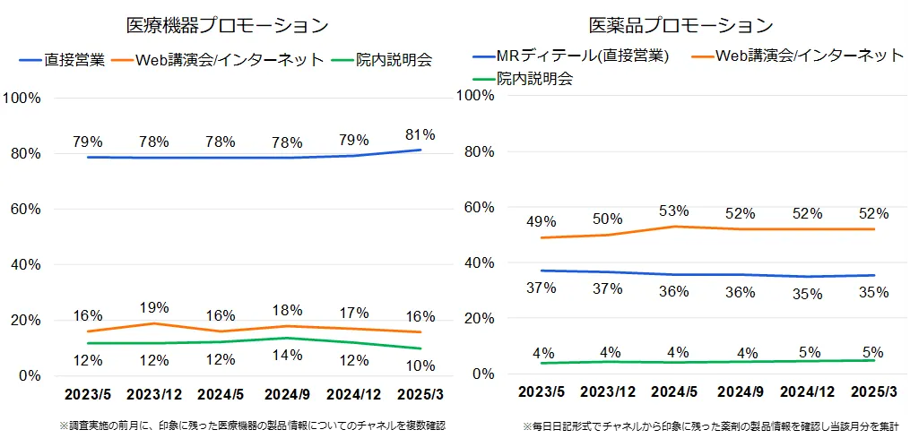調査では、「医師の働き方改革」が施行されて約1年が経過した現在の状況についても聴取されていますが、医療機器に対するプロモーションチャネルに大きな変化は見られませんでした。依然として、直接営業は重要な情報獲得手段として位置付けられています。特に3月は年度末が近いこともあり、直接営業が増加した理由として挙げられています。