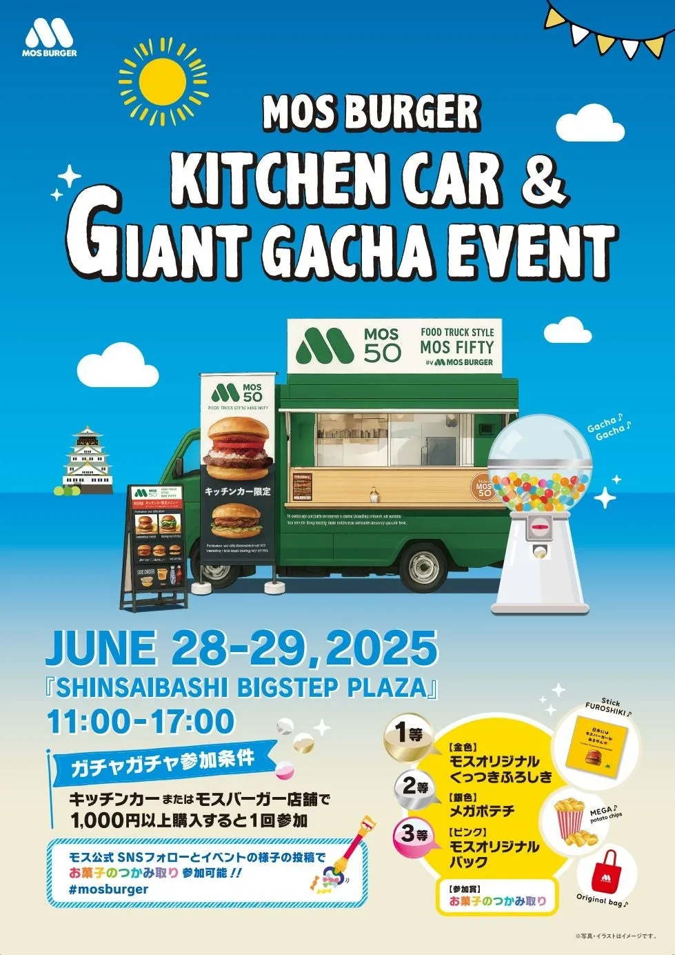 「MOS BURGER KANSAI FESTA」の一環として、2025年6月28日(土)と29日(日)の2日間、心斎橋BIGSTEPにおいて「キッチンカー MOS50」が出店します。ここでは、定番の「モスバーガー」や「テリヤキバーガー」がグレードアップされた特別メニューとして楽しめるほか、1000円以上購入のお客さまには巨大ガチャによる景品プレゼント企画も実施されます。景品としては、モスオリジナルの「くっつくふろしき」などが用意されています。