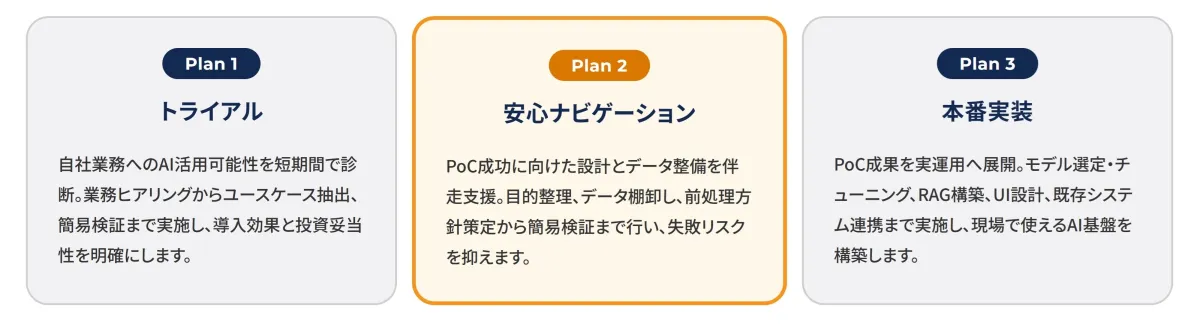 このプランは、PoCの成果を実運用に展開するためのものです。モデル選定やチューニング、UI設計などを含む、現場で使用できるAI基盤を構築します。実運用から業界特化型の学習フローまでを整え、本格的な導入を目指します。