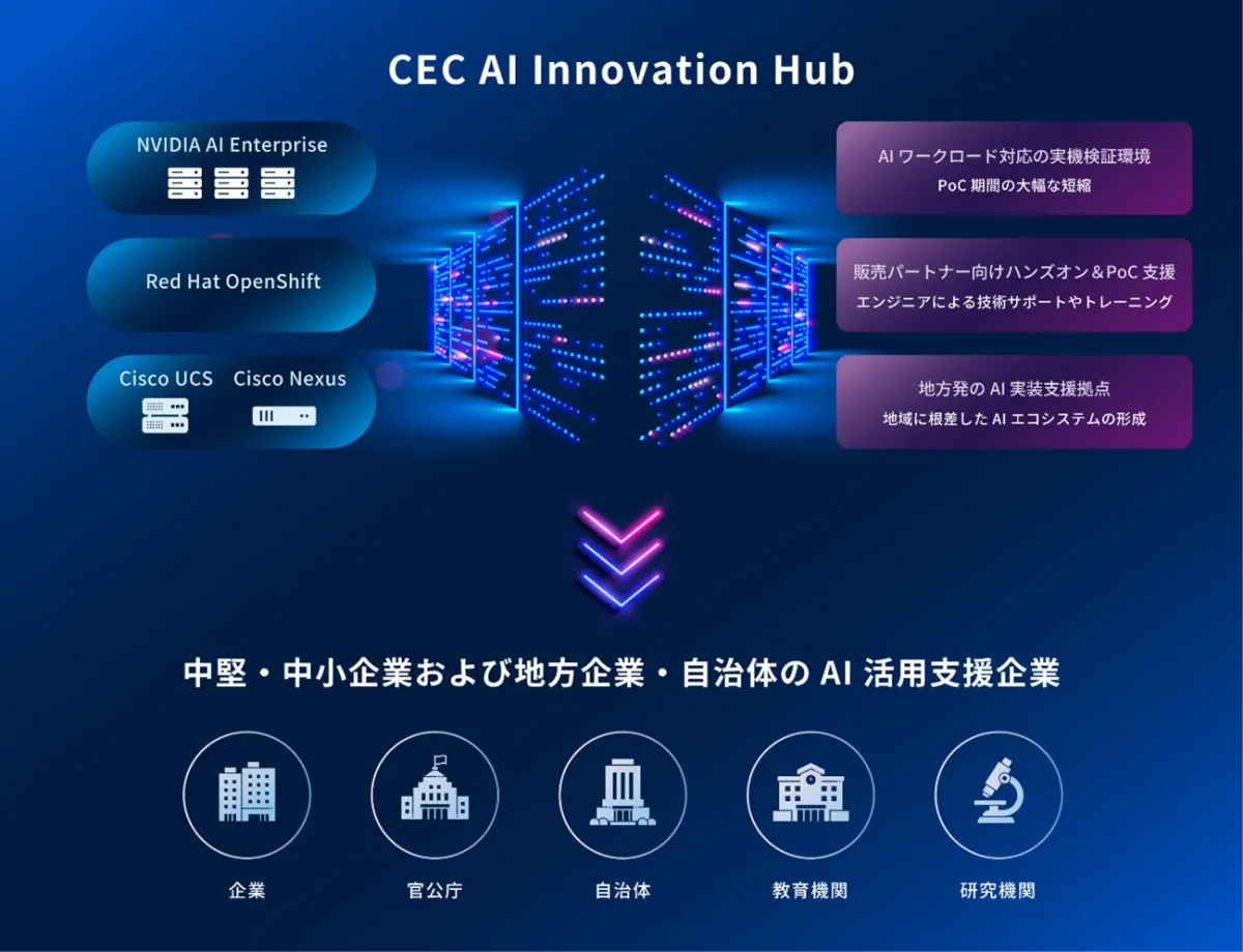 ダイワボウ情報システム株式会社(以下、DIS)は、シスコシステムズ合同会社(以下、Cisco)と提携し、CX Center内に「CEC AI Innovation Hub」と呼ばれるAIインフラ検証施設を新たに立ち上げました。この施設は、中堅・中小企業はもちろん、地方企業や自治体に向けたAI活用支援のための国内初の検証拠点として位置付けられています。