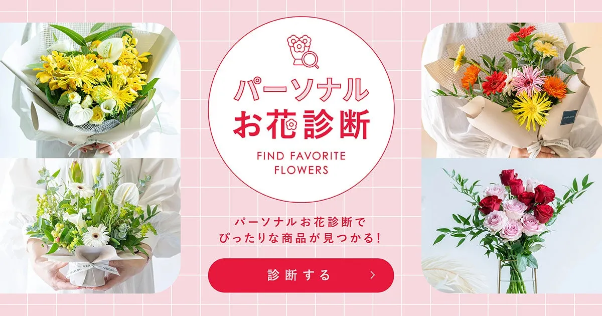 「パーソナルお花診断」では、具体的にギフトの用途や受け取り人の性格、求めるお花の雰囲気など、いくつかの選択肢から答える形式になっています。具体的な質問内容とは、以下の通りです: