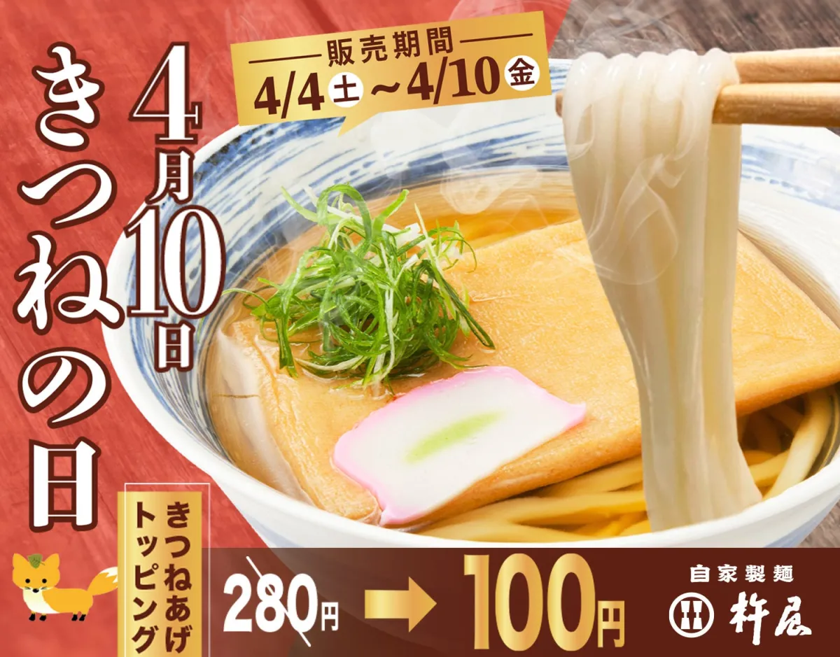 「自家製麺 杵屋」は、2026年の4月4日(土)から4月10日(金)までの期間に、毎年恒例の「きつねの日キャンペーン」を実施します。この日は「FO(4)X(10)」という語呂合わせに由来し、特に「きつねうどん」の魅力を再発見できるイベントです。