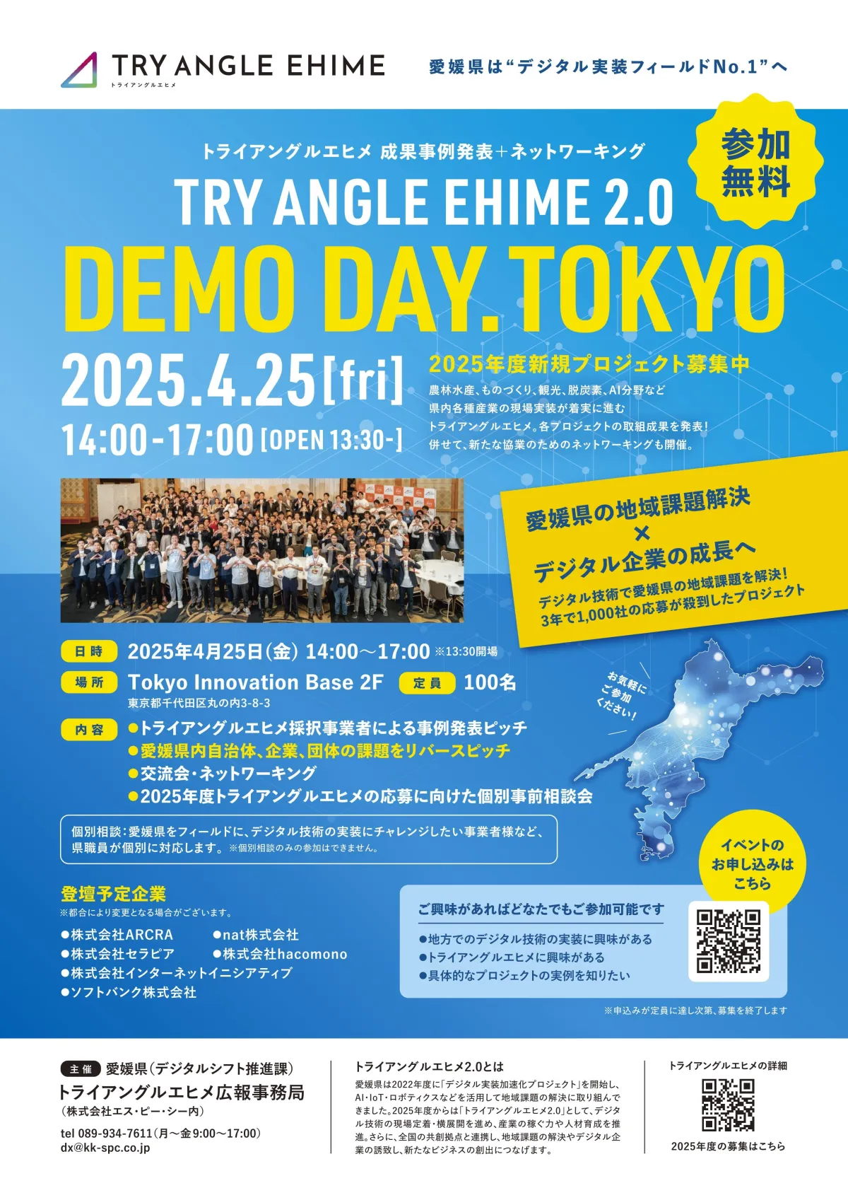 デモデイは東京のTIB(Tokyo Innovation Base)で実施され、関東圏の企業や自治体が集う重要なイベントです。特に、愛媛県内外から参加する企業や事業者たちが、デジタル技術を駆使してどのように地域の問題に取り組んでいるかを発表します。このイベントの目的は、トライアングルエヒメの影響力を広げつつ、新たなビジネスパートナーシップを築くことです。