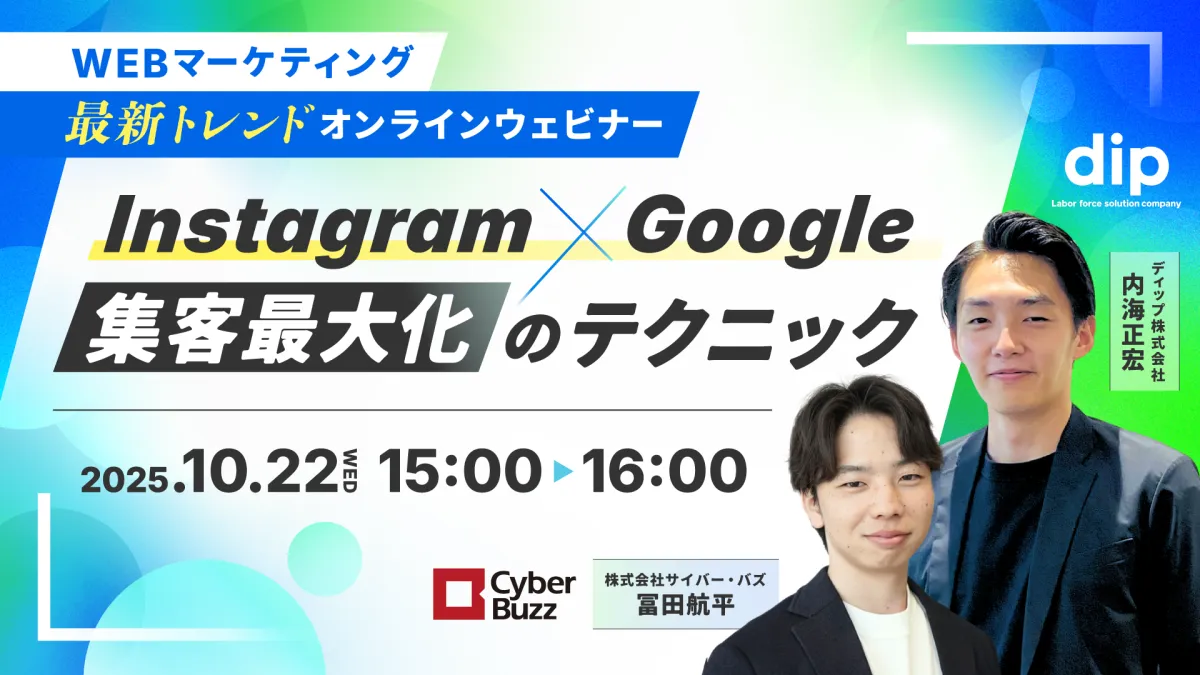 株式会社サイバー・バズとディップ株式会社が共催するウェビナー「Instagram×Google 集客最大化のテクニック」が、2025年10月22日に開催されます。本ウェビナーでは、現代のマーケティングにおいて欠かせないInstagramとGoogleを活用し、集客を最大化するための具体的なテクニックを詳しく解説します。