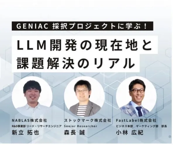 さらに、2025年6月4日には、GENIAC採択プロジェクトに関するウェビナーを開催します。参加者は、ストックマーク株式会社、NABLAS株式会社、FastLabel株式会社の研究テーマや成果、課題への具体的なアプローチについて学ぶことができます。興味のある方は是非ご参加ください。