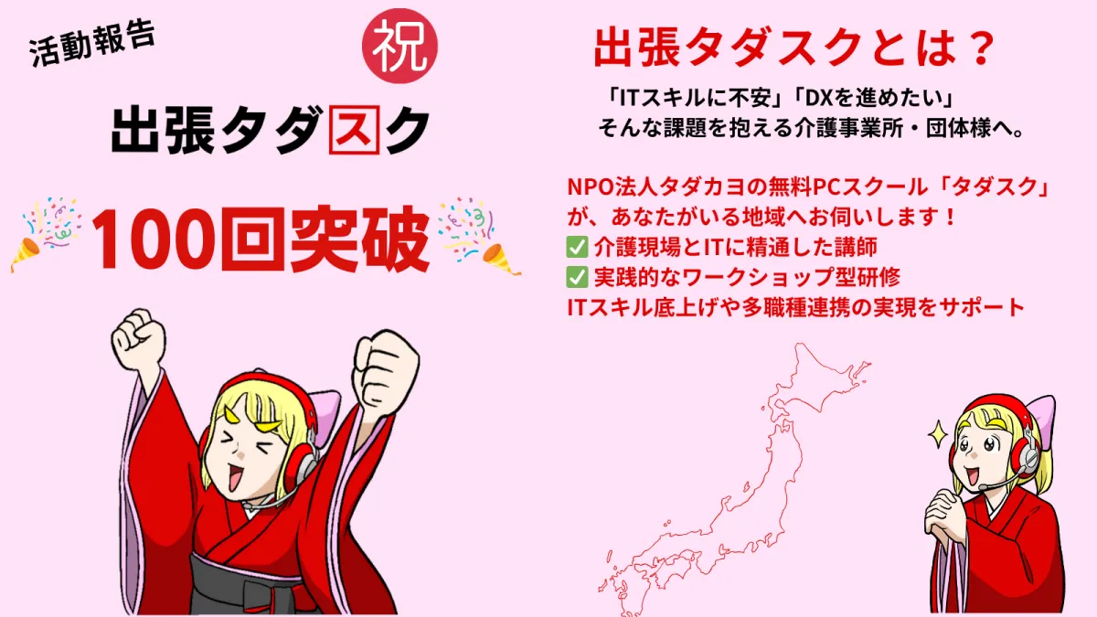 NPO法人タダカヨが主催するICT研修「出張タダスク」は、介護従事者向けの研修を全国で展開し、開催数が100回を超えました。この活動は、介護の現場が抱える人手不足やITリテラシーの差に対処するために始まり、多くの介護事業所や団体から支持を受けています。