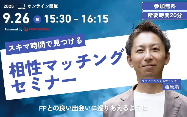 9月26日(金)午後3時30分から、オンラインにて「相性マッチングセミナー」が無料で開催されます。このセミナーは、参加者が自身に合ったファイナンシャルプランナー(FP)を見つけるためのものです。運営を行うのは、パワープランニング株式会社が提供するマネーセミナーサービス「アットセミナー」です。