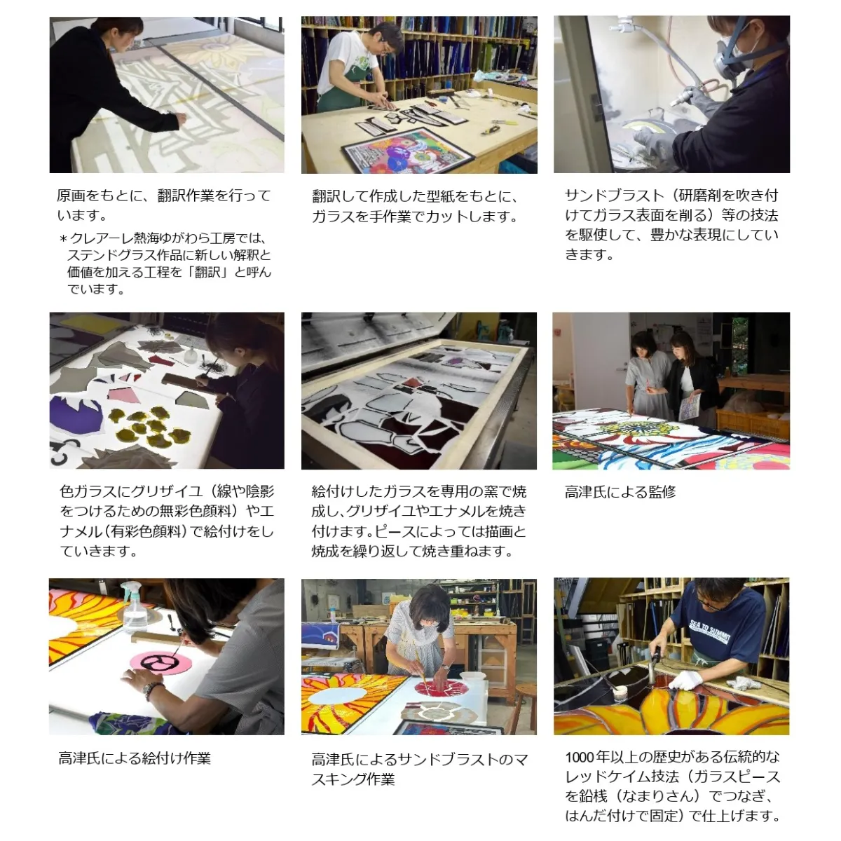 このステンドグラスは、クレアーレ熱海ゆがわら工房で制作されました。この工房は1981年に設立され、建築家の隈研吾氏が設計を担当した場所で、ステンドグラスや陶板レリーフを用いたパブリックアート作品を多く手がけています。