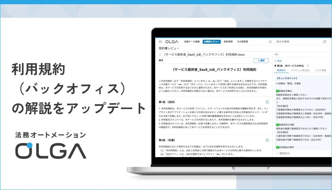 GVA TECH株式会社が提供する法務オートメーション「OLGA(オルガ)」が、その利用規約に関する解説を大幅に更新しました。OLGAは企業法務における契約書のレビューや管理を効率化するためのツールであり、今回はその中でも特に利用規約にフォーカスを当てた改訂です。