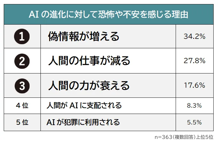 特に、偽情報の増加が最も多くの人にとって不安要素として浮かび上がっており、AI技術が悪用されることへの懸念が高まっています。過去には、個人の写真や動画が簡単に加工され、誤解や名誉毀損を引き起こす事例が多数報告されています。