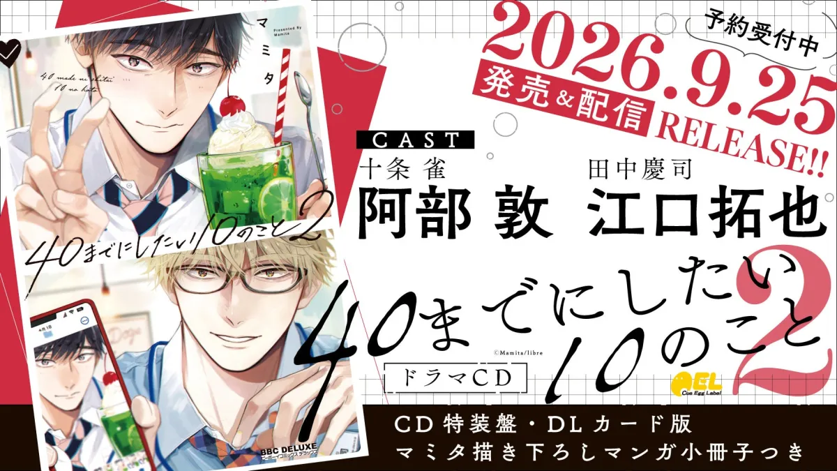 2026年9月25日、株式会社リブレから新しいドラマCD『40までにしたい10のこと2』がリリースされます。この作品は、人気シリーズ「40までにしたい10のこと」の続編として、多くのファンが待望する作品の一つです。原作を手掛けるのは、実力派の作家・マミタ氏です。