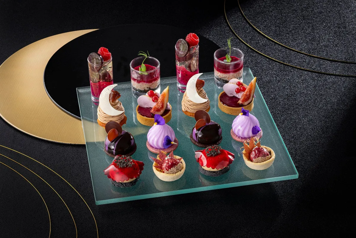 ホテルの28階に位置するバー&ラウンジ「トゥエンティエイト」では、ムーンライトの下での贅沢なひとときを演出するため、艶やかなプレゼンテーションのスイーツ5種とセイボリー3種が提供されます。秋の味覚である栗やかぼちゃから、フレッシュなフルーツまで、多彩な素材が使用されており、味わい深い体験が待っています。