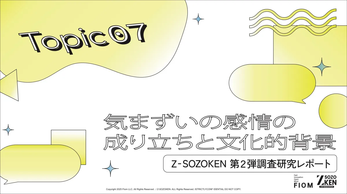 Z-SOZOKENによる最後の報告書では、第7章で「気まずい」という言葉が持つ多層的な意味に光を当てています。この言葉はもともと対人関係における痛みを表現するためのものでしたが、今では個々人の内面を語る言葉としても定着しています。先代の若者たちが「KY」によって場の空気を読むことで文化を築いたのに対し、Z世代はその文化を引き継ぎつつ、さらに一歩進んで「気まずい」を用いて、その場の気まずさを軽やかに共有するスタイルを確立したのです。