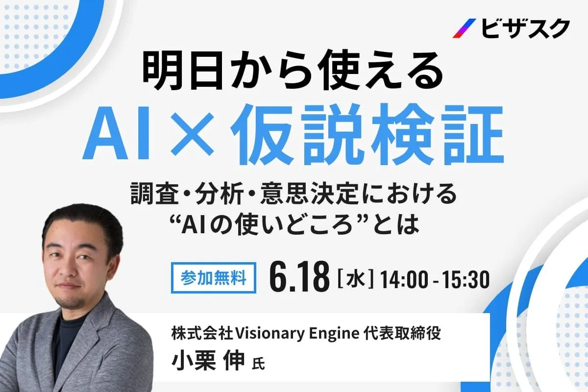 株式会社ビザスクが主催する、無料オンラインセミナー「明日から使えるAI × 仮説検証」が、6月18日(水)14:00から開催されます。テーマは「調査・分析・意思決定における“AIの使いどころ”とは」で、株式会社Visionary Engine代表取締役の小栗伸氏が講師を務めます。参加は無料で、Zoomでの開催になります。