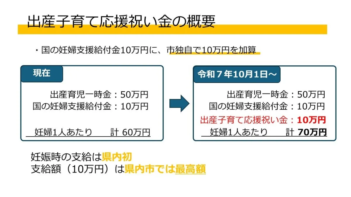 - - 妊娠時には、国からの妊婦支援給付金5万円と市からの出産子育て応援祝い金5万円を合わせた合計10万円が支給される。