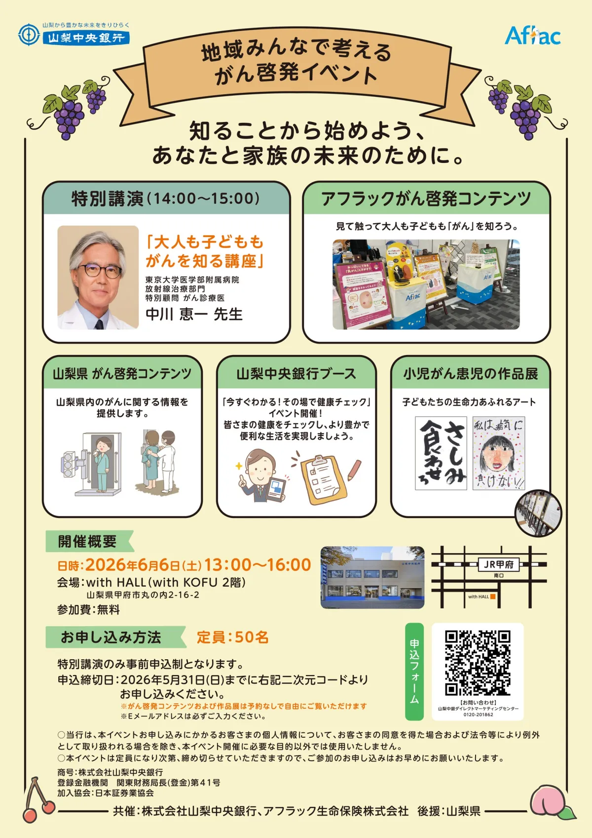 山梨県が主催する「地域みんなで考えるがん啓発イベント」が、株式会社山梨中央銀行とアフラック生命保険株式会社の共催により開催されます。このイベントは、がんの早期発見や健康の重要性を広めることを目指しています。