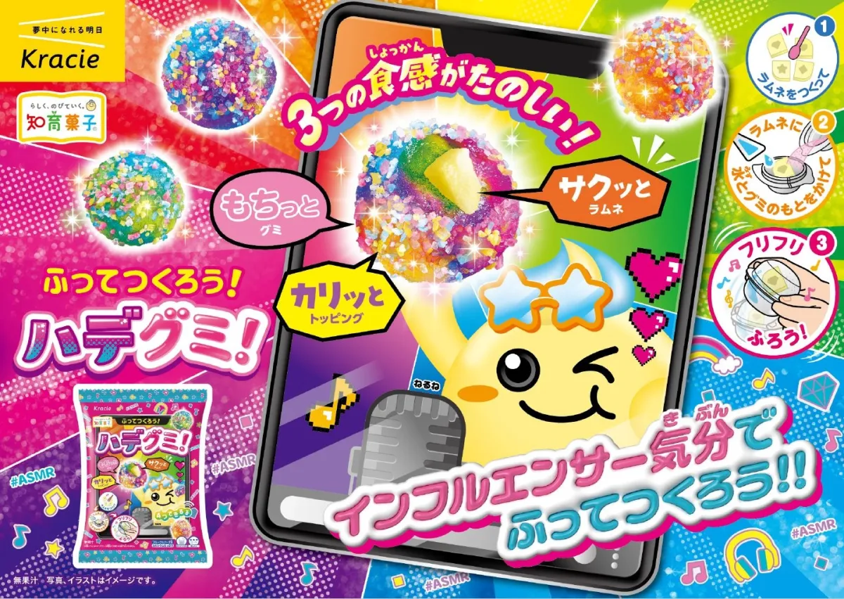 「ハデグミ!」は、容器を振って作るという新しいスタイルのお菓子です。その工程はシンプルで、誰でも失敗することなく楽しむことができます。粉と水を使い、振ることでグミがラムネにくっつき、カラフルで丸い形に変化していきます。この際に生まれる音や、見た目の変化は、まるでインフルエンサーになったような体験を提供してくれます。