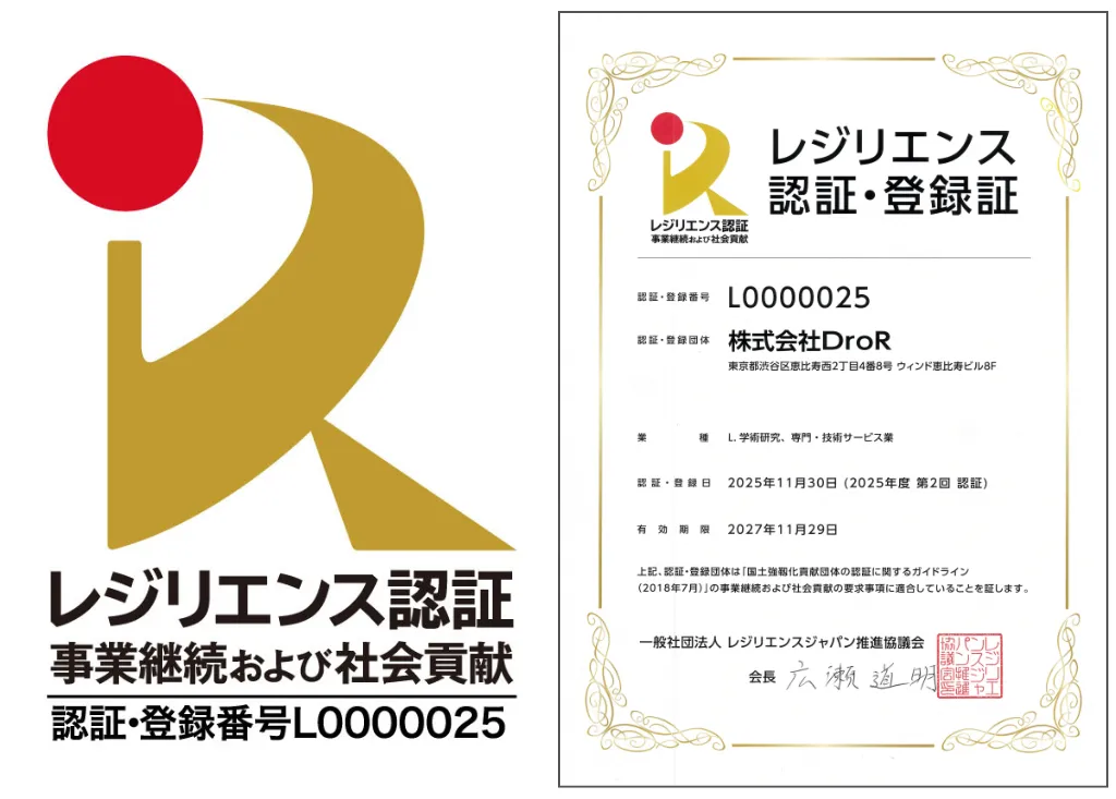 このレジリエンス認証は、内閣官房の指針に従い、事業の継続性(自助)及び社会貢献(共助)の両方を強く推進する企業に与えられます。審査は、一般社団法人レジリエンスジャパン推進協議会によって実施されており、DroRはその厳格な基準を満たしたことが認められたのです。
