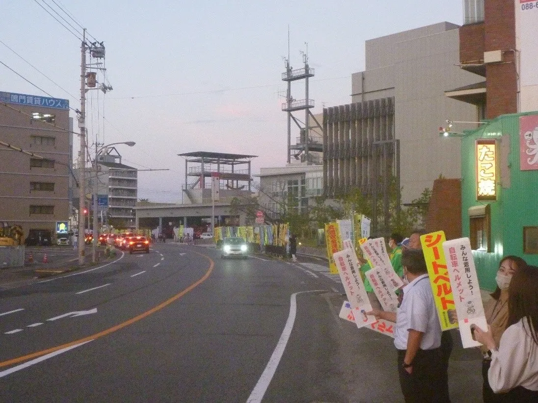 鳴門市では、秋の全国交通安全運動の最終日である9月30日に「夕暮れ時交通安全キャンペーン・早めのライト点灯啓発運動」を実施しました。この活動は、交通事故の未然防止を目的としており、市民が一丸となって運転手に注意喚起を行うものです。