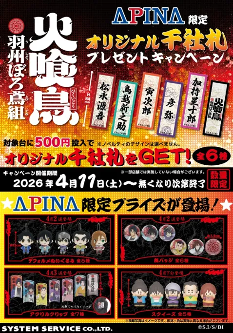 アニメ『火喰鳥 羽州ぼろ鳶組』の魅力が詰まったアミューズメント施設『アピナ』で新たなプライズが続々登場しています!特に注目すべきは、4月11日からスタートした「火喰鳥 千社札プレゼントキャンペーン」です。ここでは、その詳しい内容とプライズ景品のラインアップをご紹介します。