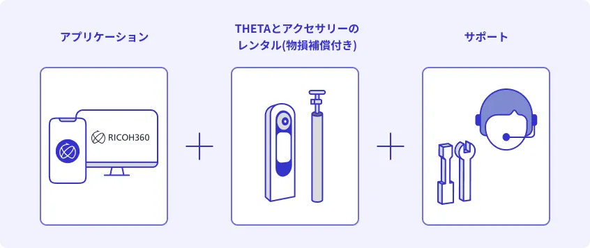 RICOH360 ビジネスパッケージは、THETAと関連アクセサリーの物損補償付きレンタルサービスも提供しています。故障時には迅速にTHETAを交換できるため、機器の不在による業務の停滞を最小限に抑えられます。