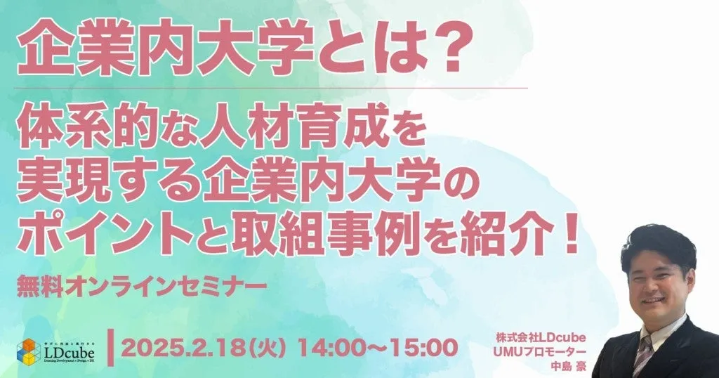 株式会社LDcubeは、2025年2月18日(火)14:00から15:00にわたり、「体系的な人材育成を実現する企業内大学のポイントと取組事例を紹介!」というテーマでウェビナーを行います。このウェビナーは、企業の持続的成長に不可欠な人材開発についての知識を深める絶好の機会です。