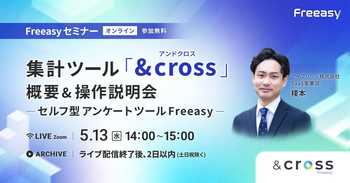 アイブリッジ株式会社が提供するセルフ型アンケートツール「Freeasy」。その中でも注目を集めている集計ツール「&cross」に関するオンラインセミナーが2026年5月13日(水)14時から開催されます。本セミナーは、これからアンケート集計を手軽に行いたい方、またすでにFreeasyを使用しているが、集計作業に課題を感じている方に向けた絶好の機会です。