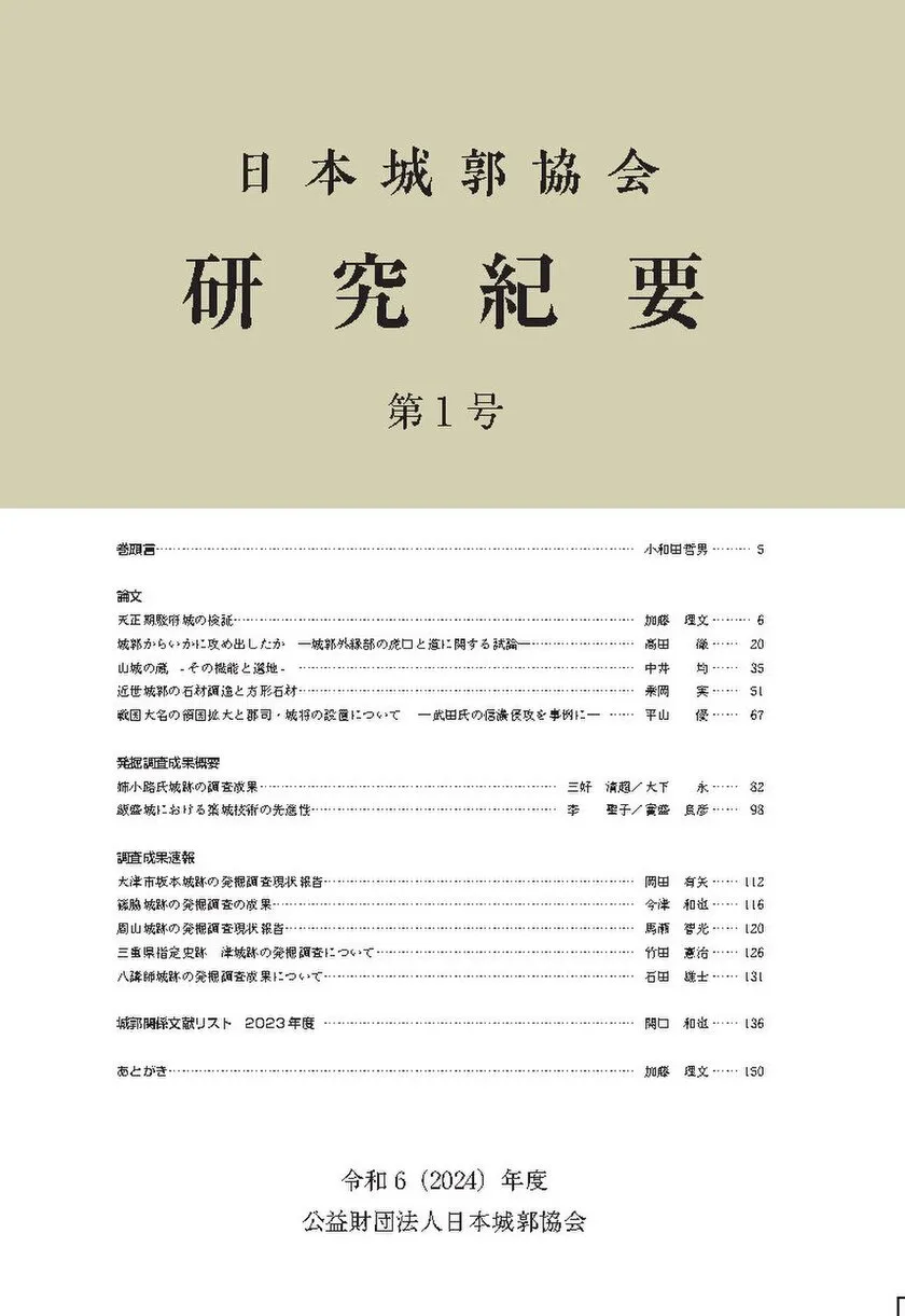 創刊号には、編集委員による論文、城郭・城址に関する最新の調査報告、さらには城郭関連論文のリストが収められています。特に、巻頭言を寄稿している小和田哲男理事長は、城郭の研究が持つ価値をわかりやすく解説しています。