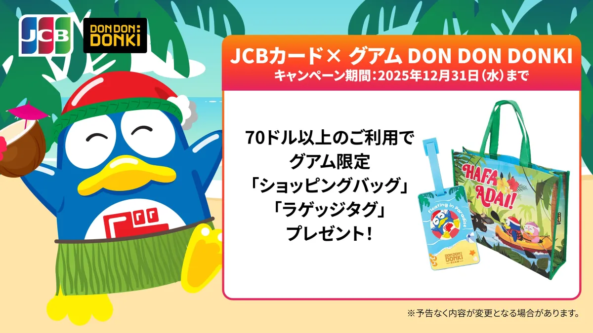 グアムの観光地「DON DON DONKI THE VILLAGE OF DONKI」で、期間限定の特別キャンペーンが始まりました。このキャンペーンは、JCBカードを使って70ドル以上のお買い物をした方に、グアム限定のショッピングバッグとラゲッジタグをプレゼントするというものです。期間は2025年12月31日(水)までとなっており、この機会にぜひご利用ください。