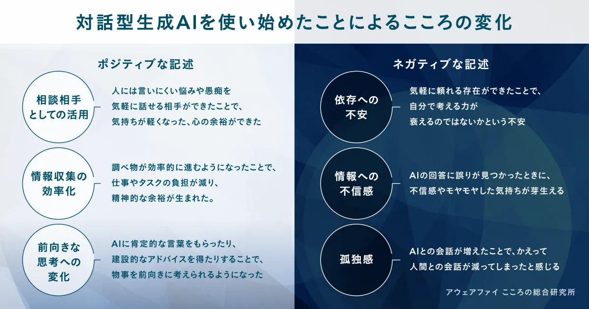 調査によると、対話型生成AIの利用が心の健康にポジティブな変化をもたらすことがあります。約半数がAIを使うことでメンタルヘルスが支えられていると感じており、心の状態に変化があったと回答した人の多くが「心が楽になった」や「ストレスが減った」というポジティブな意見を寄せています。しかし、一部の利用者は「AIに依存することで自分の考える力が低下するのではないか」と懸念しており、AIとの会話が増えることで人との関わりが減る孤独感も報告されています。
