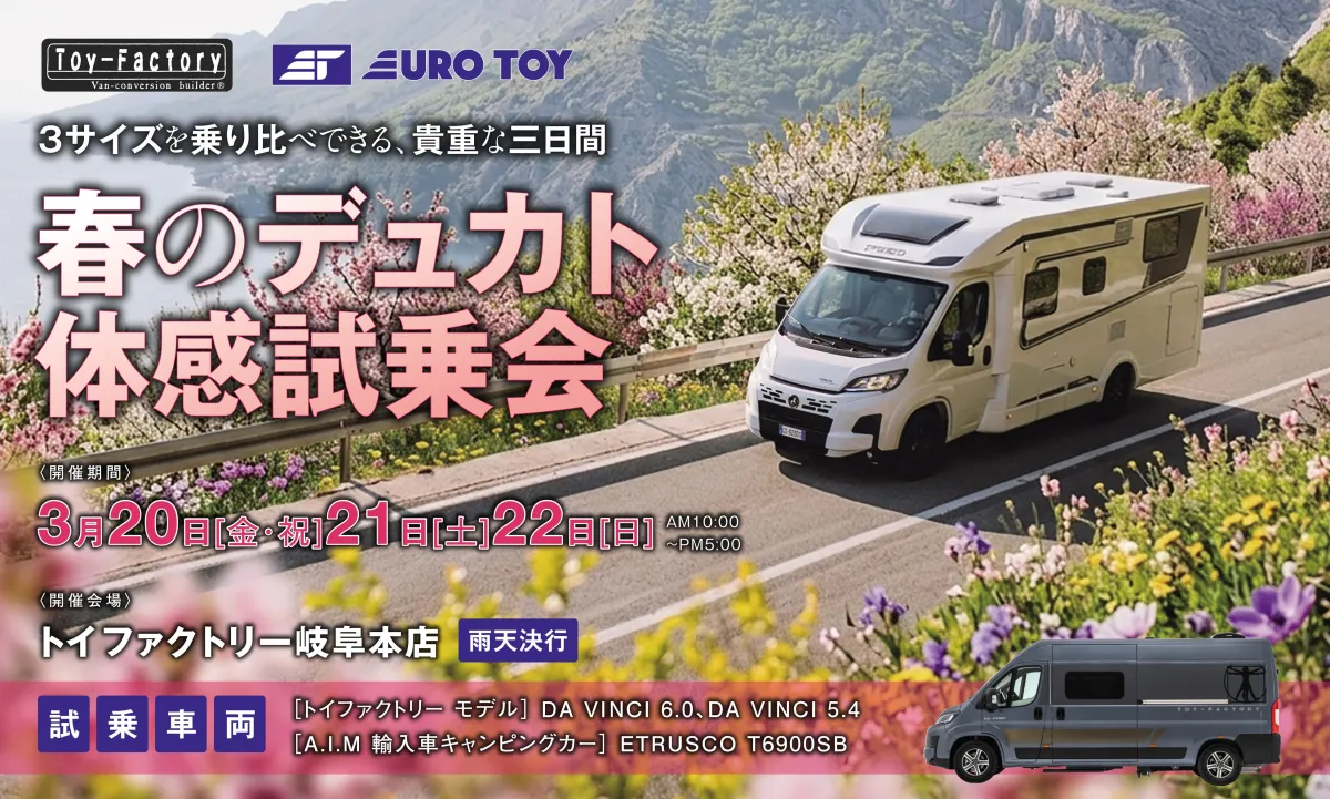 2026年3月20日(金・祝)から3月22日(日)まで、岐阜県のトイファクトリー岐阜本店にて「春のデュカト体感試乗会」が行われます。このイベントでは、FIAT DUCATO(フィアット デュカト)ベースのキャンピングカーの中から3つのサイズモデルを特別に乗り比べることができる貴重な機会が用意されています。大変人気の高いイベントで、普段なかなか試乗できないモデルもお楽しみいただけます。