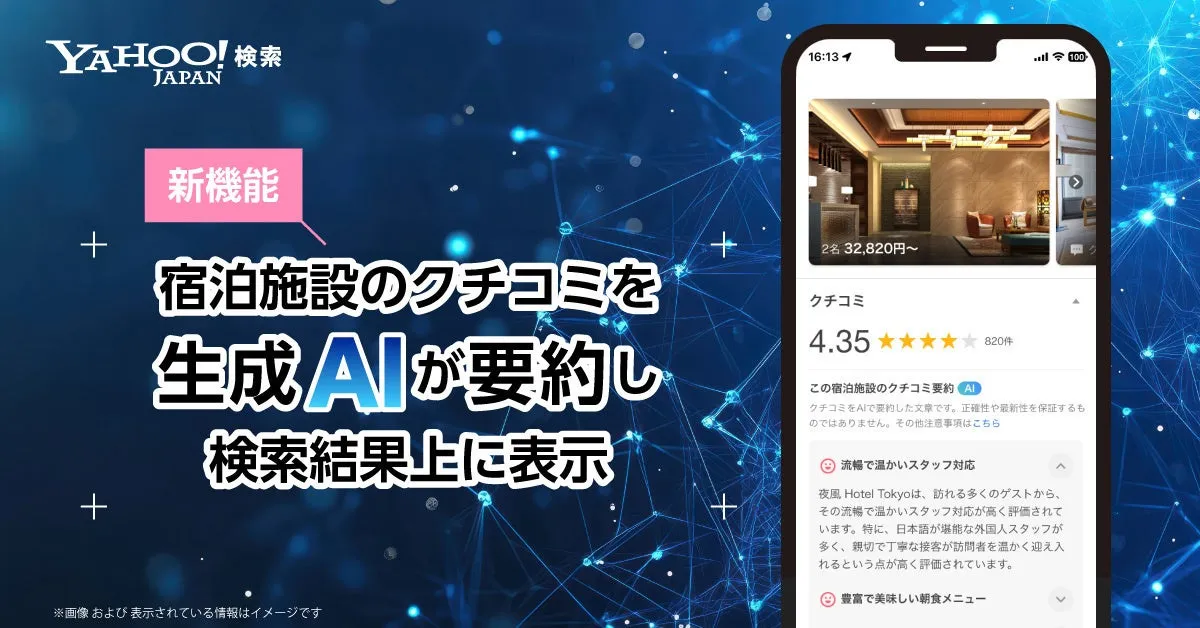 LINEヤフー株式会社は、旅行者にとって便利な新機能を「Yahoo!検索」に追加しました。今や宿泊施設のクチコミを生成AIが要約し、検索結果の上に表示する機能が始まりました。これにより、多くの宿泊施設情報をもっと分かりやすくユーザーに提供できるようになります。