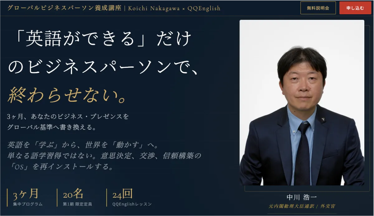 2026年5月、株式会社QQ Englishは元内閣総理大臣通訳の中川浩一氏と連携し、ビジネスパーソン向けの新たな英語講座を開設します。この講座は、「交渉での成功を導く英語OS」を習得するためのものです。全6回にわたるプログラムは定員20名で、ビジネスシーンに即した実践的な内容です。