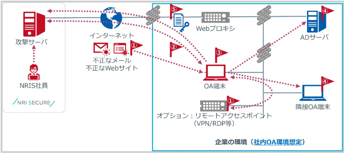 この新サービスは、特定の攻撃シナリオに沿って実施され、例えば「外部攻撃者がActive Directoryを利用して重要情報を持ち出すことができるか」という流れで評価を行います。特に近年では、従業員の端末を狙った不正侵入が増加し、そこでのActive Directoryの掌握によって重要情報が漏えいするケースが増えているため、実際の攻撃に即したテストが求められています。